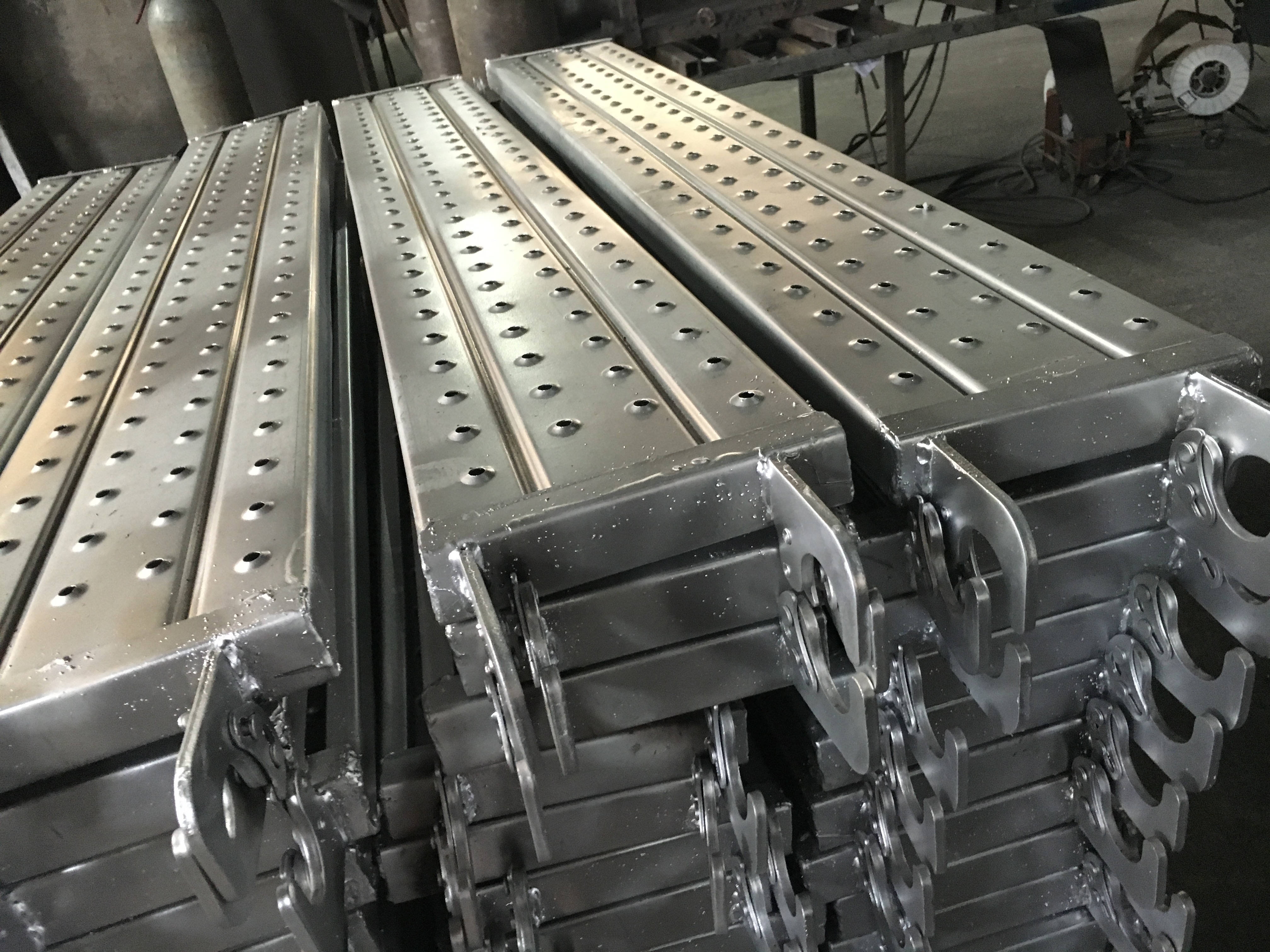 鍍鋅鋼跳板采用厚度1.5mm的Q235B鋼板,其材料和生產(chǎn)應(yīng)符合國家標(biāo)準(zhǔn)GB15831-2006鋼管腳手架扣件。
