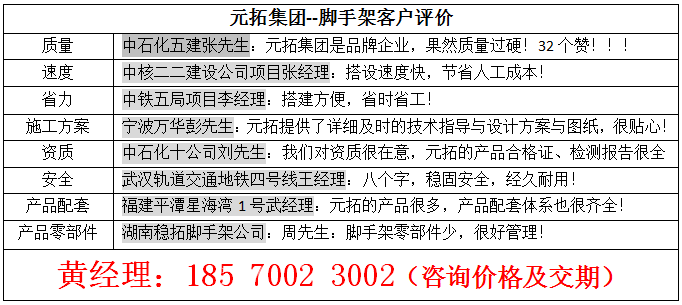 元拓腳手架建筑材料的客戶中,很大一部分是老客戶。為什么客戶定購(gòu)過一次的,會(huì)一而再,再而三的選擇元拓腳手架建筑材料呢?因?yàn)榭蛻魧?duì)元拓腳手架的評(píng)價(jià)是:元拓腳手架滿堂腳手架好用不貴,價(jià)位合理,經(jīng)久耐用,而且服務(wù)一流,品牌響亮。 元拓腳手架碗扣式多功能滿堂…